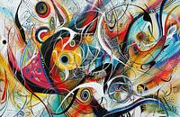 Wirwar - Het doek viert een wervelwind van kleur en beweging met een abstracte compositie die het oog leidt door een dynamische wirwar van lijnen, cirkels, en vormen. De kleuren zijn een mix van warme en koele tinten, waaronder rood, blauw en geel, die samenwerken om een levendige en toch harmonieuze balans te creëren.