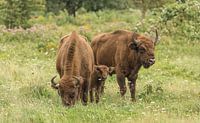 Een Wisent kalf voelt zich veilig tussen pa en ma in natuurgebied Slikken van de Heen in Sint Philipsland in de provincie Zeeland in Nederland. Het gebied wordt beheerd door Het Zeeuwse Landschap.