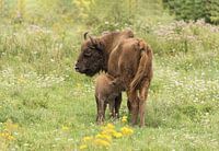 Een Wisent, Europese Bizon, zoogt haar kalf, in natuurgebied Slikken van de Heen in Sint Philipsland in de provincie Zeeland in Nederland. Het gebied wordt beheerd door Het Zeeuwse Landschap.
