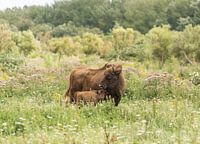 Een Wisent, een Europese Bizon, met haar kalf in natuurgebied Slikken van de Heen in Sint Philipsland in de provincie Zeeland in Nederland. Het gebied wordt beheerd door Het Zeeuwse Landschap.