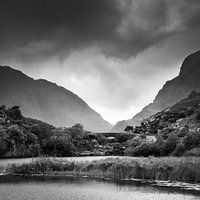 Een zwart-wit foto van de 'Wishing Bridge' bij de Gap of Dunloe, ook wel bekend als Bearna an Choimín, wat 'kloof van het gemeenschappelijke land' betekent. Het is een smalle bergpas die van noord naar zuid loopt in County Kerry, Ierland,