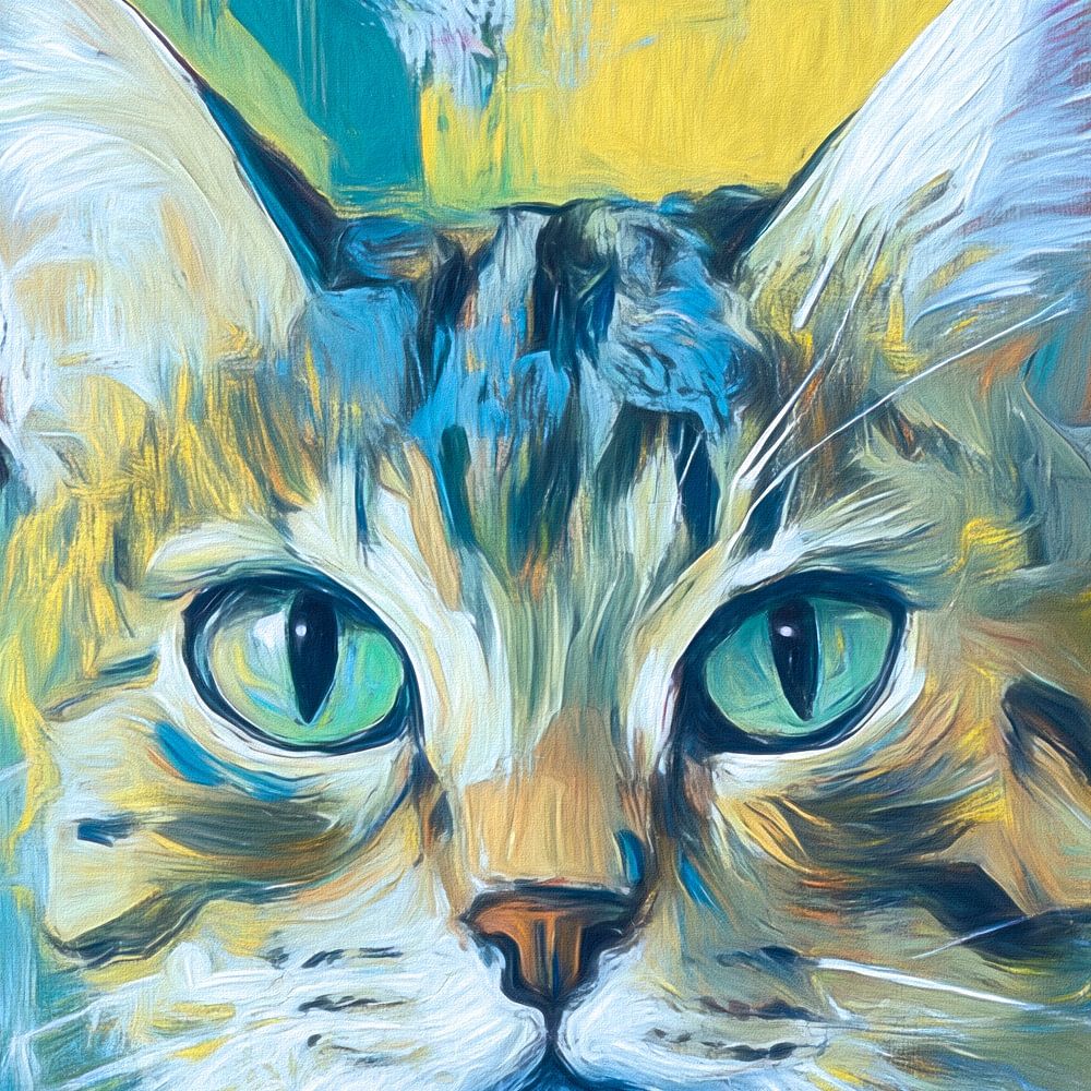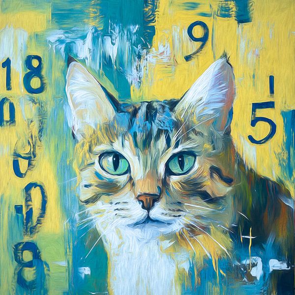 Een gestreepte kat met felgroene ogen staat voor een abstracte achtergrond. Cijfers zijn in felle kleuren over het doek verspreid.