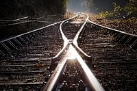 Wissel op het station van Wijlre in het tegenlicht van de opkomende zon op een koude herfstdag.