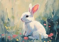 Wit Konijn - Op dit schilderij zie je een schattig wit konijn dat rustig in een kleurrijke tuin zit, omringd door vrolijke bloemetjes in zachte tinten, terwijl de achtergrond een vriendelijke pastelachtige uitstraling heeft.