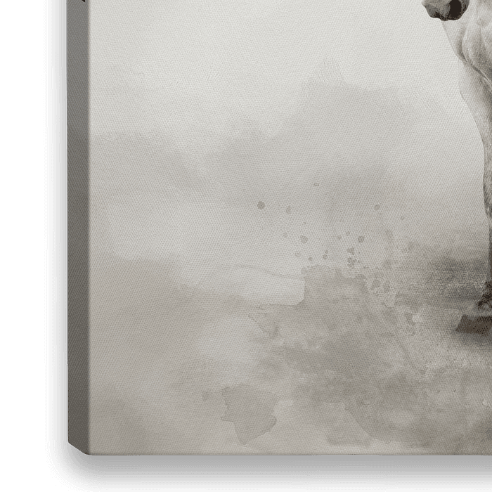 Een sierlijk wit paard in een abstract aquarel landschap in de kleuren beige, taupe en bruin. De schoonheid van deze prachtige, elegante dieren komt volledig tot zijn recht in dit mooie, hand geschilderde paarden kunstwerk.