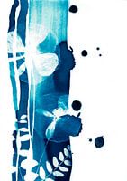 Een blauw werk op een witte achtergrond, gemaakt met cyanotypie maar met een waterverf uitstraling.