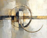 Details: abstract schilderij, moderne kunst, gouden kunst, cirkel kunst, geometrisch schilderij, balans kunst, rustgevend schilderij, abstracte geometrie, minimalistisch design, kunstcollectie