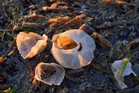 Wit fossiel van zee-egel op zandstrand tijdens zonsopkomst (roze gloed zonlicht). De zon schijnt door de schelp