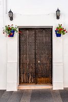 Oude statige houten deur met afbladderende verf. De donkere deur zorgt voor een mooi contrast met de sneeuwwitte muur en de gekleurde decoratie bloempotten met bloemen. De foto is genomen in Mijas in Andalusië, Spanje,
