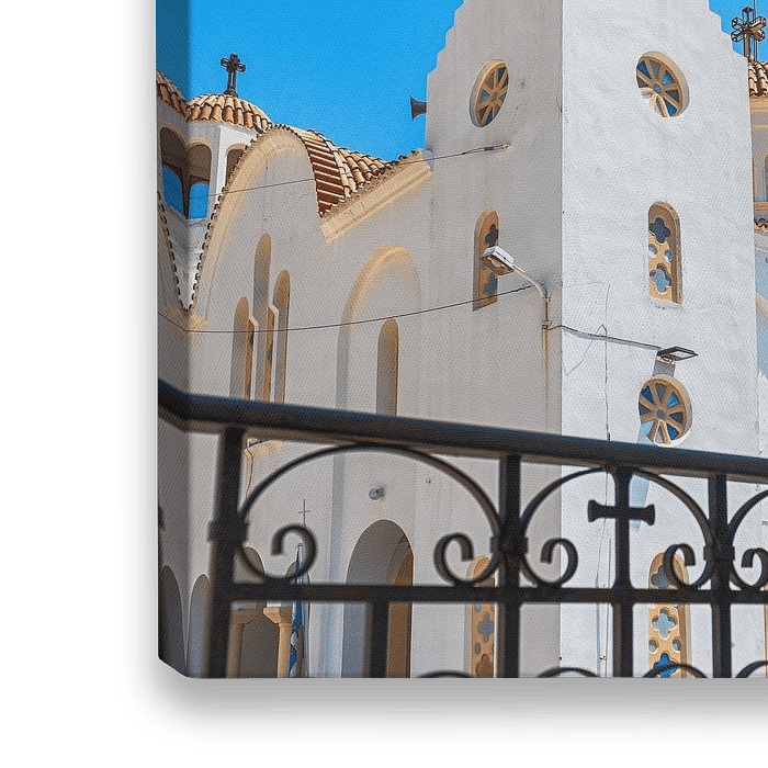 Leuk doorkijkje onder een boog en achter een mooi hekje, van de Kerk van de Heilige Vrouwe in het bergdorpje Kritsa op Kreta (Griekenland).