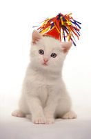 Wit klein poesje met blauwe ogen en een feestmuts op en een verbaasde uitdrukking