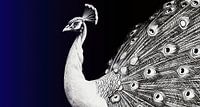 Een witte negatieve tekening van het lichaam van een pauw steekt af tegen een donkerblauwe achtergrond met kleurverloop. Het contrast tussen het witte negatief en de donkere achtergrond geeft de scène een opvallende visuele aanwezigheid. De pauw in zijn volle vorm straalt gratie en majesteit uit tegen de donkere achtergrond. Het…