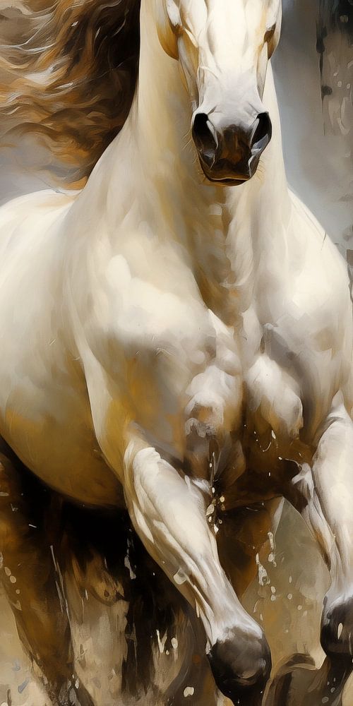 Wit paard in galopis een indrukwekkend schilderij dat de kracht en gratie van een wit paard vastlegt terwijl het met volle snelheid door het water beweegt. Het tafereel speelt zich af in een serene omgeving, waar de schilder het paard in de richting van de toeschouwer heeft vastgelegd, waardoor er een directe interactie ontstaat tussen het majestueuze dier en de kijker.