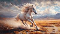 Een klassiek plaatje, wit paard in beweging, vol dynamiek, deze dieren maken indruk zoals bijna geen ander dier!