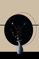 Wit a-symetrisch gevormd vaasje met daarin een takje met bloesem. Een beige achtergrond waarop een zwarte ronde vorm.