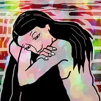 Ht zwart-wit tegen een helder gekleurde achtergrond maakt het een opvallend portret. Schilderij van een naakte jonge vrouw op een stoel, met een afwezige blik in haar ogen. In gedachten, met het hoofd leunend op haar armen Een collage waarin een combinatie van technieken. Aquarel, tekening en linosnede. De stille afbeelding in…