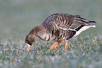 Witkopgans ( Anser albifrons ), wilde gans in de winter, lopend over een bevroren weide, op zoek naar voedsel, typisch beeld, zeer mooi verenkleed patroon, helder licht, natuurlijke kleuren, wilde dieren, Europa.