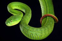 Een portret van een Witlipbamboeadder tegen een zwarte achtergrond. Deze felgroene gifslang is een boombewoner en komt voor in Zuidoost-Azië.