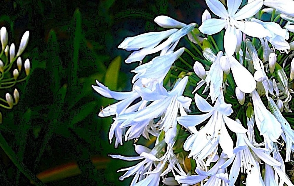 Foto van een Afrikaanse witte lelie die mooi en stralend met de kleine bloemetjes en knopjes afsteekt tegen een zwarte achtergrond.