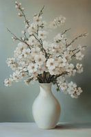 Een verstilde, bijna etherische compositie waarin zachtheid en licht de hoofdrol spelen. Centraal staat een witte vaas, eenvoudig en puur van vorm, als een stil anker in een wereld van nuance. Uit de vaas rijzen ranke takken op, gedragen door een fragiele elegantie, bezet met tere kersenbloesem in een bijna doorschijnend wit. De…