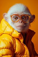 Witte Chimpansee met gele jas en geel oranje bril en achtergrond. Vrolijk en grappig geheel. Modern en eigentijds.