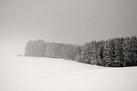 Besneeuwd landschap met velden, bedekt met een deken van sneeuw en een bos. De foto is gemaakt in zwart-wit en een warme, minimalistische tint.