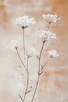 Witte Fluistering in Aardetinten is een subtiele, poëtische compositie die de delicate schoonheid van de natuur vastlegt op het doeken van linnen, gewassen in warme terratinten. De kunstwerk nodigt uit om de stilte van het landschap te ervaren, waar de zachte aanwezigheid van fluitekruid zich mengt met de robuuste kracht van dunne, bruinzwarte takjes. De witte bloeiwijzen van het fluitekruid lijken als een fluistering door de lucht te zweven, licht en ongrijpbaar, terwijl de takjes, met hun aardse tinten, een solide, organische structuur bieden aan het werk.