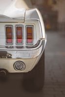 Achterzijde van een eind jaren '60 Ford Mustang Fastback. Roomwit met radial banden.