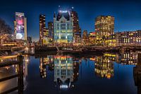 Het Witte Huis in Rotterdam, gelegen aan de Oude Haven, spiegelend in het water, tijdens het zgn. "blauwe uurtje".