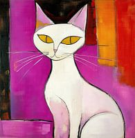 Witte Kat | Witte Kat Op Felgekleurde Achtergrond - Op dit schilderij zie je een witte kat met grote, gele ogen, die opvalt tegen een achtergrond van felle paarse en oranje tinten, waardoor het een levendige uitstraling krijgt.