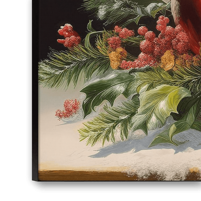 Den, hulst, kerstbal, sneeuw, rood, groen. Nostalgie, verlangen naar Kerstmis. Een prachtig, sfeerverhogend kunstwerk voor aan de muur. Wegdromen in een White Christmas.