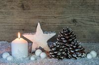 Koop de foto Witte Kerstmis kaars decoratie met sneeuw, ornamenten en houten achtergrond van Alex Winter als print op canvas, aluminium dibond, (ingelijste) fotoprint, behang en ArtFrame. Voor jou op maat geprint in Fine-Art kwaliteit.