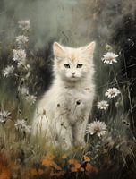 Deze lieflijke afbeelding toont een jonge, witte kitten die rustig zit tussen een veld vol madeliefjes en zachte, oranje bloemetjes. De kitten heeft een delicate, pluizige vacht en grote, nieuwsgierige ogen die met een zachte, onschuldige blik naar voren kijken. De witte en groene tinten van de omgeving harmonieëren perfect met de lichte, bijna etherische uitstraling van de kitten, terwijl de subtiele oranje accenten van de bloemen een warme toets aan het geheel toevoegen. Het zachte daglicht dat de scène verlicht, versterkt de dromerige en serene sfeer van het tafereel. Dit kunstwerk vangt de schoonheid en onschuld van een jong dier in een natuurlijke omgeving, en straalt een gevoel van rust en harmonie uit dat uitnodigt tot stille bewondering.