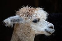Witte Lama met heel veel haar tegen donkere achtergrond, kauwend op een houtje
