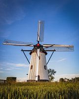 Een typisch Hollands plaatje van deze prachtige witte molen in Meeuwen, Noord-brabant. Deze foto is genomen vlak vóór zonsondergang met wat bewolking in de achtergrond. Het graan op de voorgrond zorgt voor een karakteristiek Nederlands beeld met mooie blauwe lucht. In de regio Altena tref je meer van dit soort unieke molens aan.