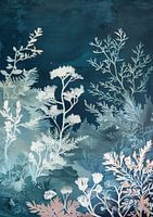 Witte Planten | Witte bladeren op blauw - In dit planten schilderij zie je fijne, witte takken en bladeren die tegen een diepblauwe achtergrond staan, wat een kalme en serene sfeer creëert met een moderne uitstraling.