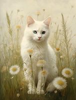 Deze serene afbeelding toont een witte poes die rustig zit te midden van een veld vol met zachte, pluizige bloemen en grassen. Haar heldere blauwe ogen kijken nieuwsgierig naar haar omgeving, wat haar een rustige en onschuldige uitstraling geeft. De witte vacht van de poes en de delicate pluizenbolletjes rondom haar creëren een…