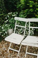 Twee witte stoelen in een Engelse tuin met witte bloemen