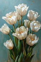 Witte Tulpen | Whisper of Gold in White - Dit bloemenschilderij toont een groep witte tulpen met elegante gouden accenten die de schoonheid en verfijning van de bloemen benadrukken.
