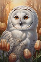 Ontdek de serene schoonheid van de natuur met dit prachtige ontwerp, waar een majestueuze witte uil tussen de zachte oranjetinten van herfsttulpen zit. De uil, bekend om zijn wijsheid, brengt een gevoel van rust en bedachtzaamheid in elke ruimte, terwijl de levendige bloemen een vleugje kleur en leven toevoegen. Het is een ontwerp dat natuur en sierlijkheid met elkaar verweeft, ideaal om een rustige maar boeiende sfeer te creëren in uw huis of kantoor. Laat de intense blik van de uil u inspireren en de warme tinten van de bloemen uw geest kalmeren. Dit stuk is perfect voor liefhebbers van natuurlijke elegantie en zij die een kunstwerk zoeken dat spreekt zonder woorden.