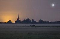Grondmist over de weilanden bij een dorp midden in de nacht, verlicht door het blauwe maanlicht. Op de achtergrond een kerk en als je goed kijkt zie je de Witte Wieven voorbij fladderen.
