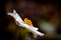 Zijaanzicht van de bloem van een witte anemoon met oranjekleurige meeldraden tegen een donkere achtergrond.