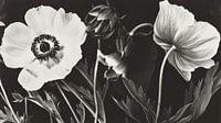 Dit kunstwerk heeft een elegante en mysterieuze uitstraling met een sterk contrast tussen licht en donker. De stijl doet denken aan een mix van botanische illustraties en fine-art fotografie, waarbij de bloemen en planten een bijna etherische, grafische kwaliteit krijgen. De zwart-witte en subtiel getinte compositie geeft het werk een…