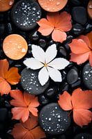 Deze betoverende afbeelding toont een sublieme combinatie van contrasten. Een delicate witte bloem ligt elegant op een bed van zwarte kleine zwarte steentjes. Tussen en op de donkere stenen zijn hier en daar mooie herfstige bladeren te vinden, die een vleugje warmte en kleur toevoegen aan het tafereel.