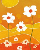 Abstract landschap in de zomer met witte bloemen in de zon. De kleuren naast wit - geel, oranje en rood - geven vooral de hitte van het zonlicht in de zomer weer.