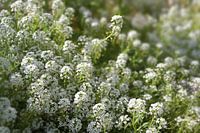 Witte bloemen van Iberis sempervirens, ook wel candytuft genoemd, een altijdgroene bodembedekker voor rotstuin en zonnige locatie, full frame achtergrond, kopieerruimte, geselecteerde focus, smalle velddiepte