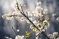Close-up foto van bloemetjes met een blauw-grijze achtergrond. Het licht op dat op de bloemetjes valt maakt dat de tak met bloemetjes uit de foto springt. Door de zachte achtergrond met neutrale kleuren staat deze foto leuk aan de muur.