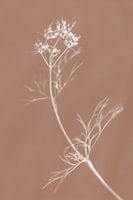 Een delicaat plantje met dunne stengels en kleine bloesems is afgebeeld tegen een achtergrond van zachte tinten van de nieuwe kleur van het jaar Mocha Mousse (Mokka). De minimalistische compositie benadrukt de ingewikkelde details van de bladeren en bloemen in het wit, tegen een donkere onscherpe achtergrond. Prachtige minimale…