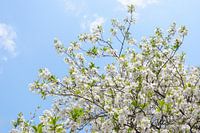 Heerlijke frisse lente foto met bloesem aan de bomen. De witte bloemen steken af tegen de blauwe lucht met wolken. De groene blaadjes geven de foto extra kleur.