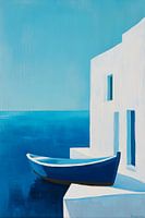In zachte blauw- en wittinten nestelt een eenvoudige boot zich tegen de koele muur van een gestileerd gebouw, terwijl het kalme water op de achtergrond een gevoel van vrede en rust uitstraalt. De heldere compositie en harmonieuze kleuren nodigen de kijker uit om zich onder te dompelen in een wereld van ontspanning.